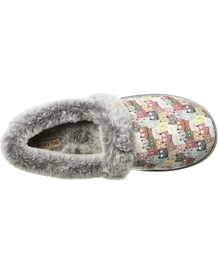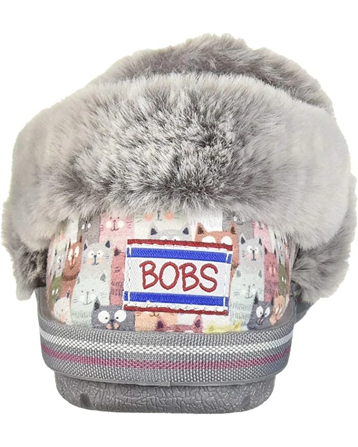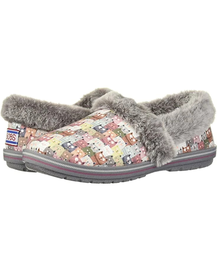 - A plush faux-fur collar, colorful cartoon cat print, and slip-on design make the BOBS from SKECHERS® Too Cozy slipper the perfect style to keep you warm and comfortable this cold-weather season.