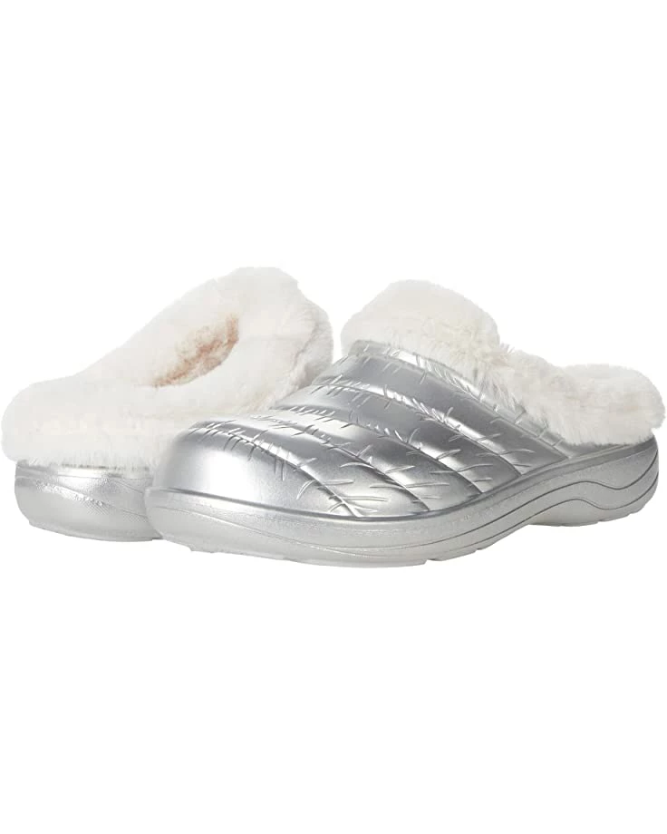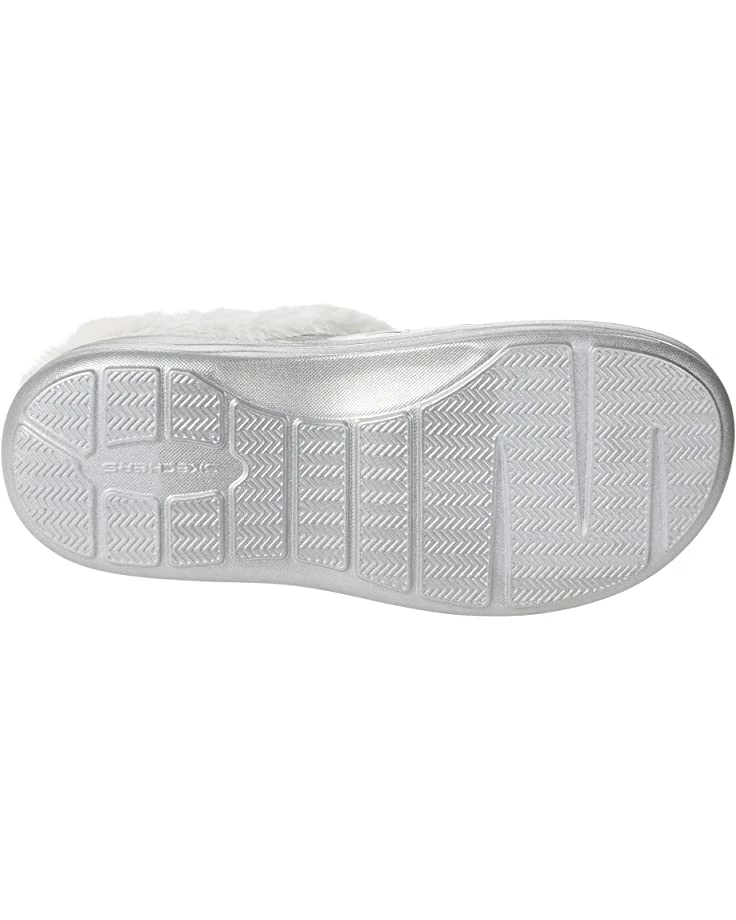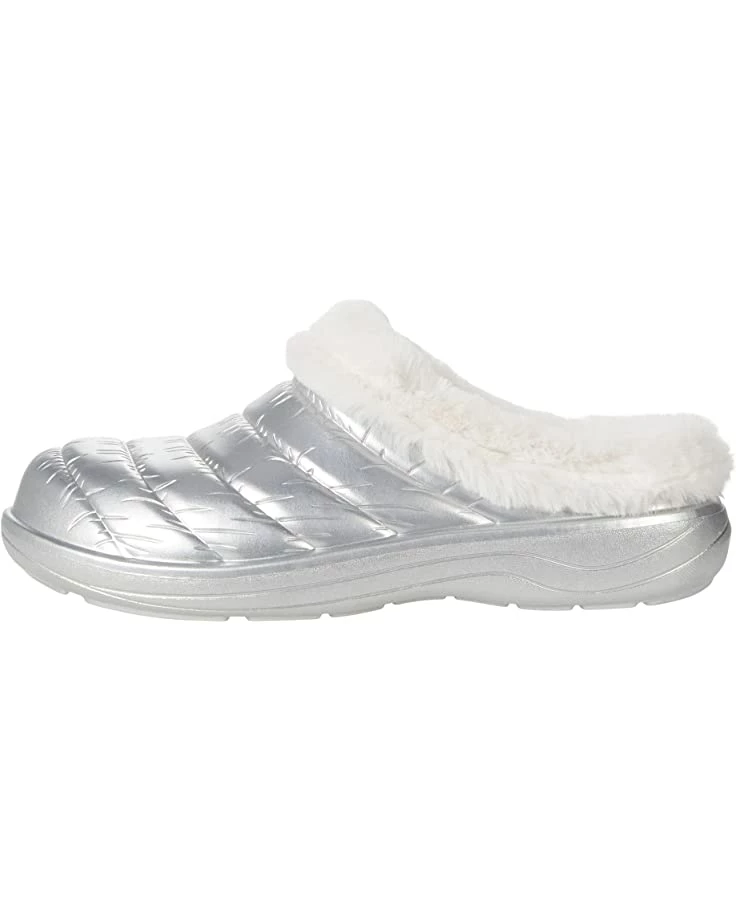 - Slip into plush comfort and shimmering style with the SKECHERS® Foamies Cozy Camper Metallic Puffer Clog w/ Faux Fur.