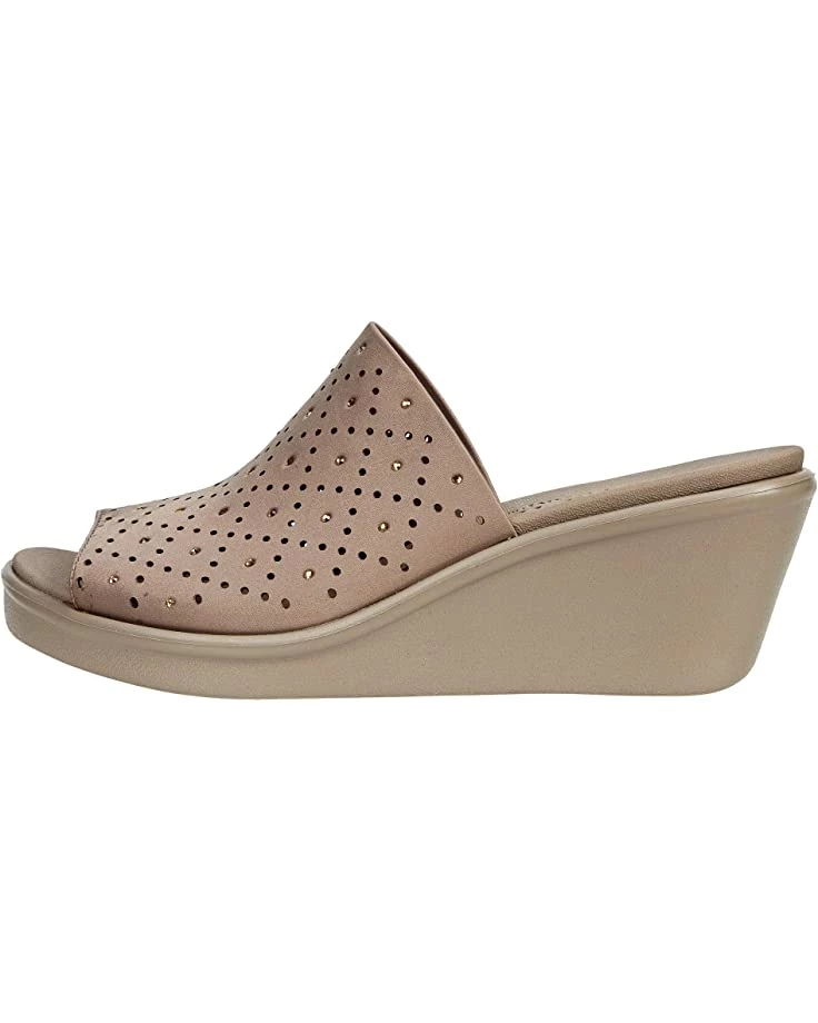 - Wedge heeled casual comfort vegan slip-on sandal design.