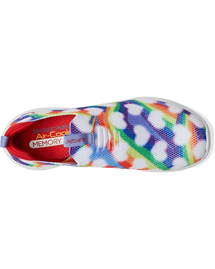 - Round toe silhouette with brightly colored rainbow and heart print throughout the upper.