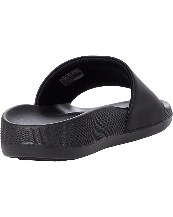 - Smooth synthetic upper in athletic recovery slide sandal design.