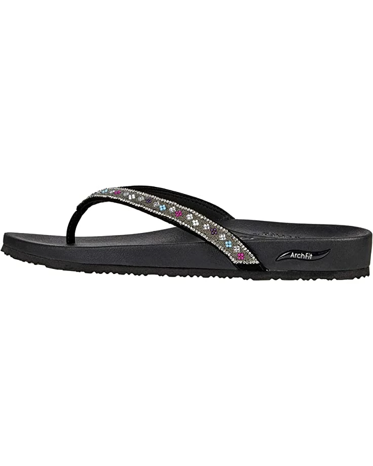 I bought these flip-flop sandals for an Hawaiian vacation. I bought them because of the advertised arch support. I needed the support because I have tendinitis in my foot and a flat sandal actually causes pain. These were perfect and I wore them constantly on my vacation. I had one issue with the size. I normally wear an 8 1/2. These do not come in half sizes so I ordered the 9. Too big. I returned them and got the 8 and it was perfect. The styling is very cute with a little bling. Perfect for the pool, but also went well with casual street clothes after pool time.