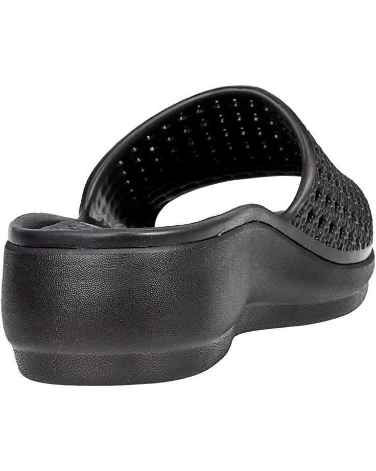 Reading reviews helped me choose a size that is perfect for me. I generally wear a size 7M in sandals and a 7.5 in walking shoes. Nearly every reviewer mentioned the shoes ran large. I ordered a size 6 that is just right. I’d ordered both the beige and black thinking I’d send one pair back, but because they fit well, I loved both colors and they are so very comfortable, I decided to keep both. Today, a day that found me on my feet for many hours straight, ended in surprise that nothing hurt. I love that there’s a bit of height to these slides making them work well with pants and capris. They do have that flip flop sound, but what’s summer without that?
