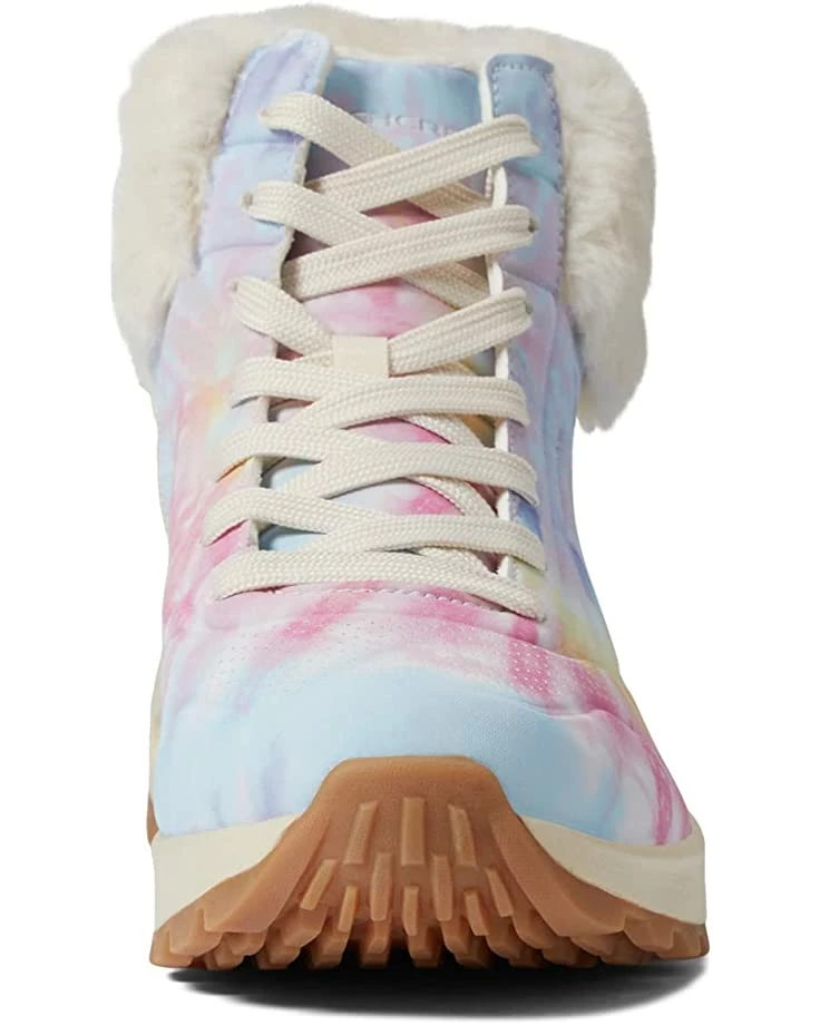 - Lace-up closure complementing a rainbow-themed texture.